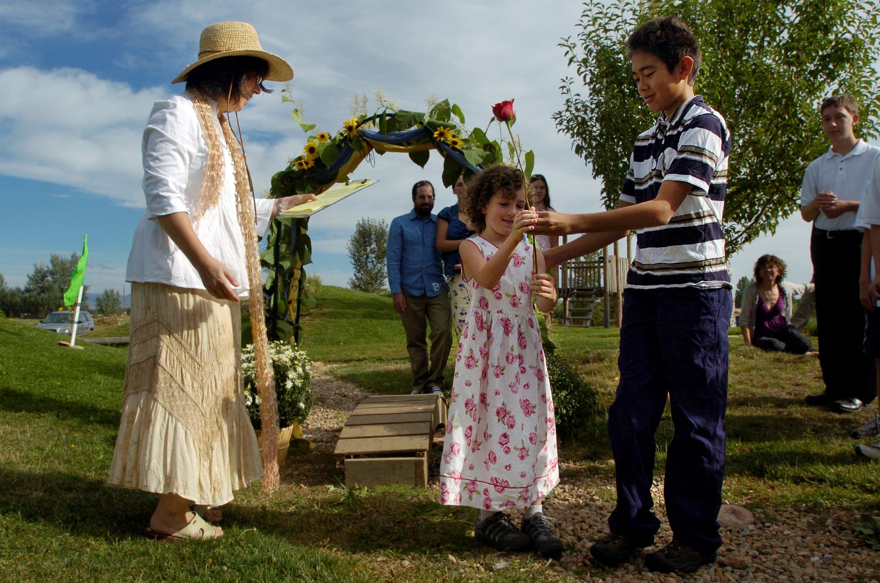 Red Rose Ceremony at Boulder Valley Waldorf. The first day of school is a rite of passage for the new first graders, marking the beginning of their journey through grade school. Each first grader receives a rose presented by the eighth-grade students, who welcome the young ones in to the “big” school.